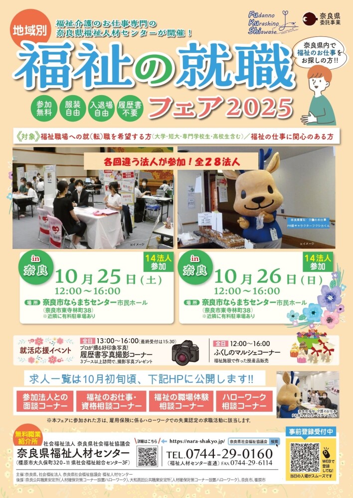 当法人が、10月25日(土)奈良市ならまちセンターにて開催される「第3回地域別 福祉の就職フェア2025in奈良」に参加します。