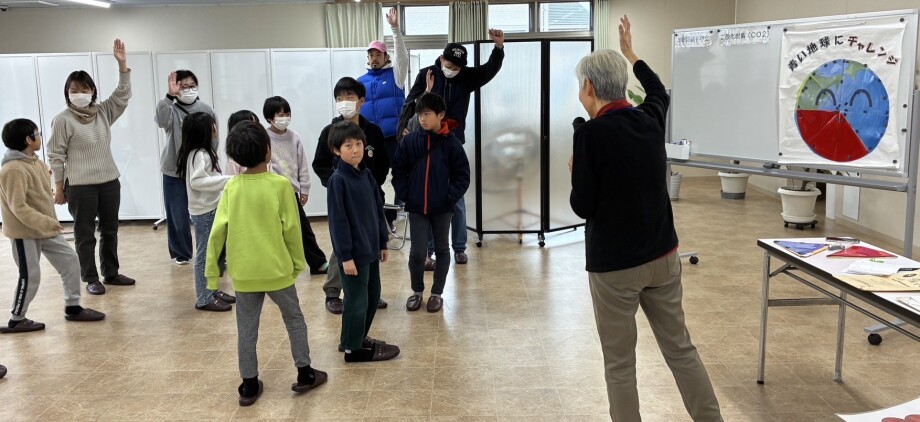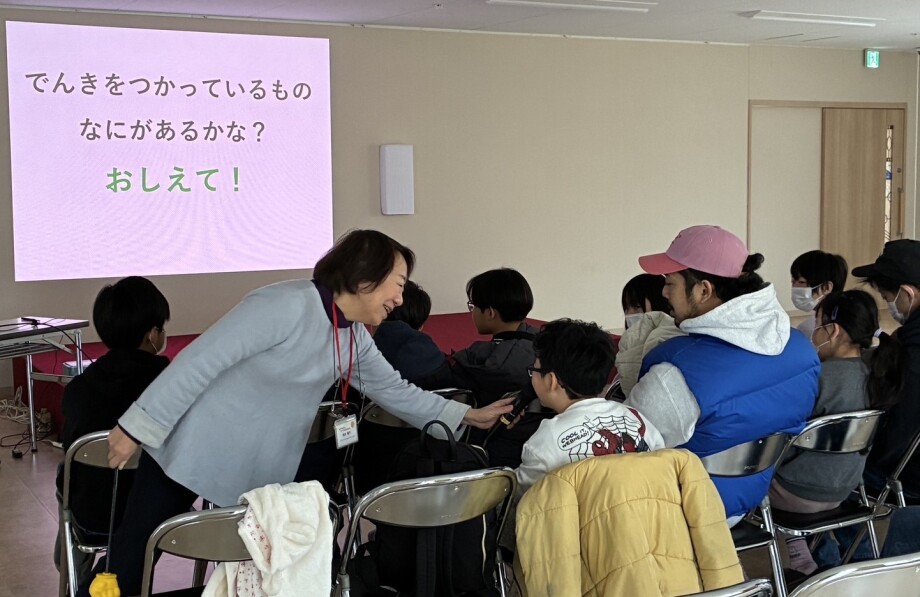 「電気を使うことで二酸化炭素が出ます。どんなものが電気で動いているかな?」「せんぷうき!」「パソコン!」質問やクイズを交えながら地球のためになることを考えました。