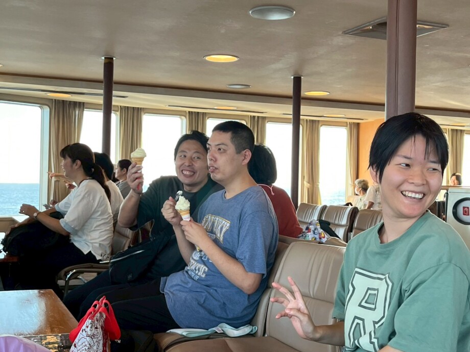 デッキに出て、外の空気を吸ったり、波の音を感じたりして特別なクルージング体験をされる利用者さん、ソフトクリームを手に船内で落ち着いて外の景色を楽しみむ利用者さんそれぞれロイヤルプリンセス号を満喫しました。