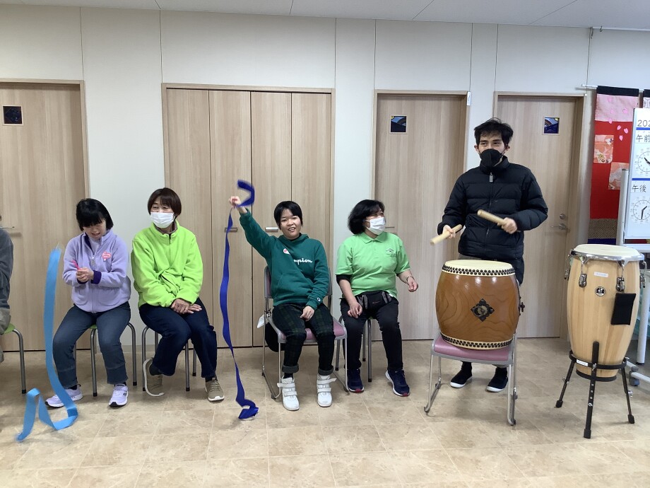 2026.02.19 その他 みんな大好き♡エンジョイムジカ♪ エンジョイムジカは人気のプログラムです(≧◇≦) 音楽が流れはじめると自然と身体が動きだします 今日は太鼓やリボンをつかってリズムをとり、みんなで一つになって楽しみました(^^♪