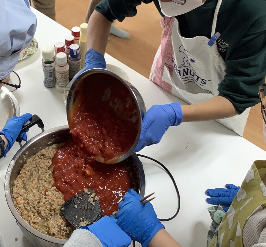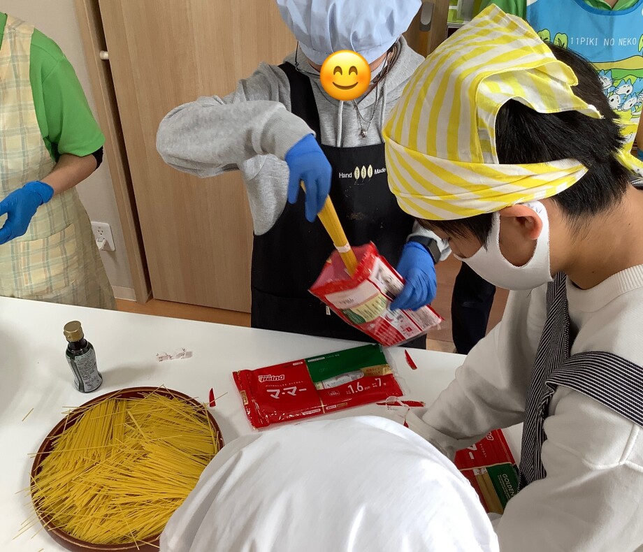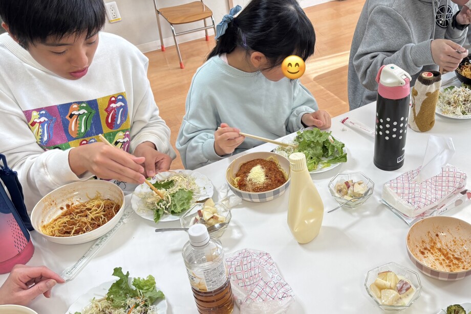 今月のクッキングは、ミートスパゲッティ・野菜サラダ・フルーツヨーグルトを作りました。