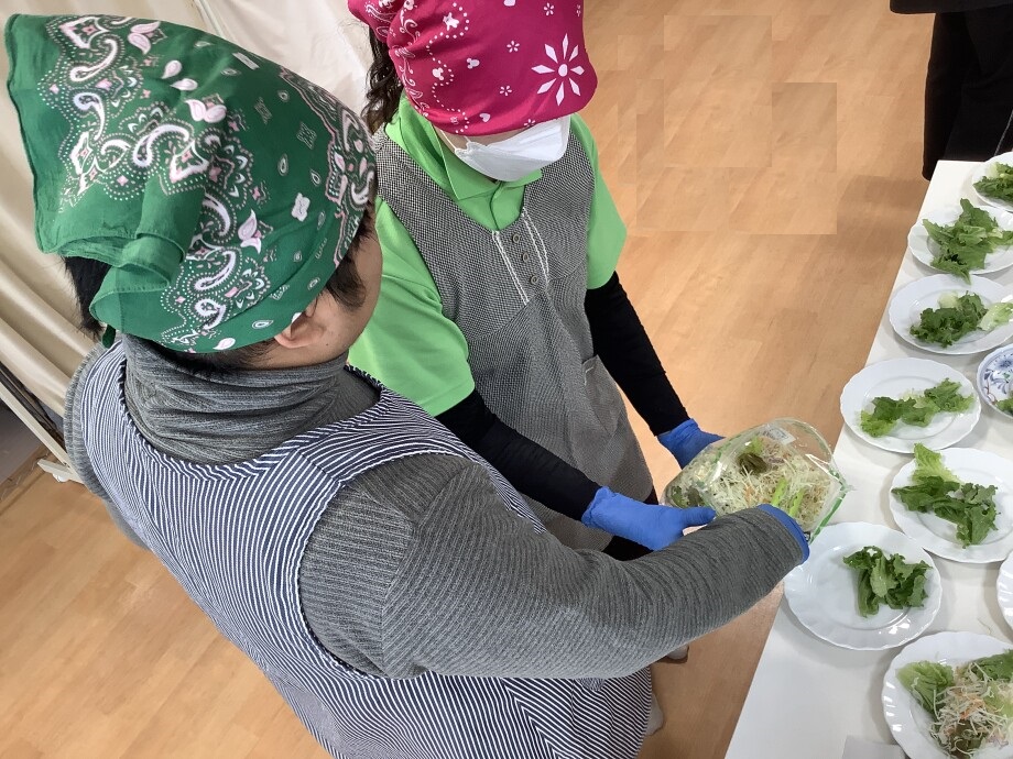 レタスをちぎったり、ブロッコリーを切ったりして盛り付けました。
