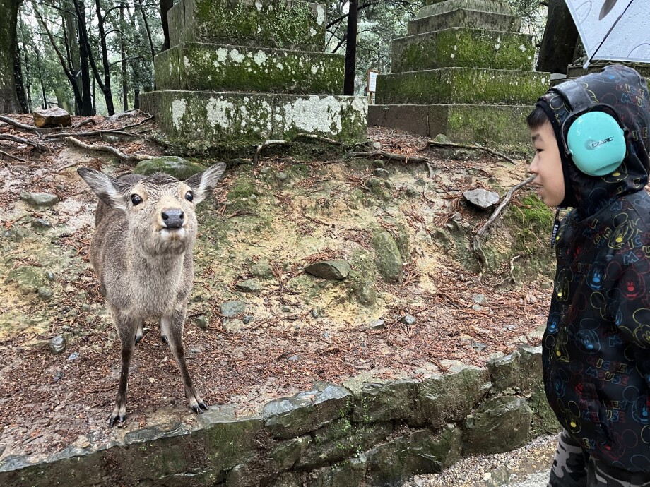 小雨が降るなか、奈良公園の鹿さん🦌にどんぐりを届けに行きました。