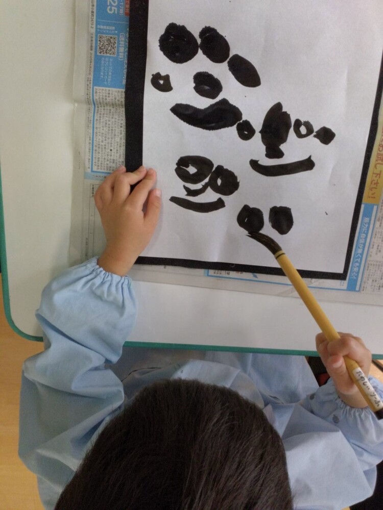 初めての墨、初めての筆、初めての半紙に思い思いのものを書きました。