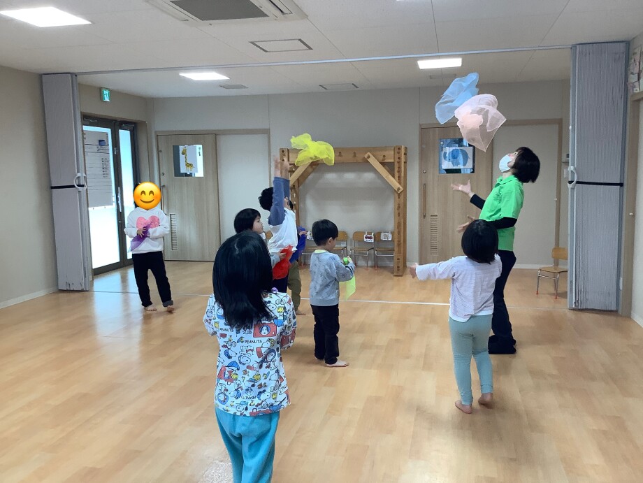 柔らかい感触のカラースカーフを使い、音楽に合わせてたくさん体を動かして遊びました。