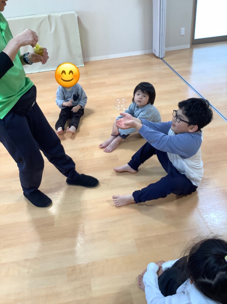 最後にみんなで輪になり、一人一人職員からシャボン玉のプレゼントをもらいました!潰さないように手でお椀を作り、しっかり受け取ることができました。