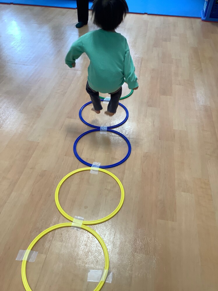 まずは、フープの上を両足でジャンプです。